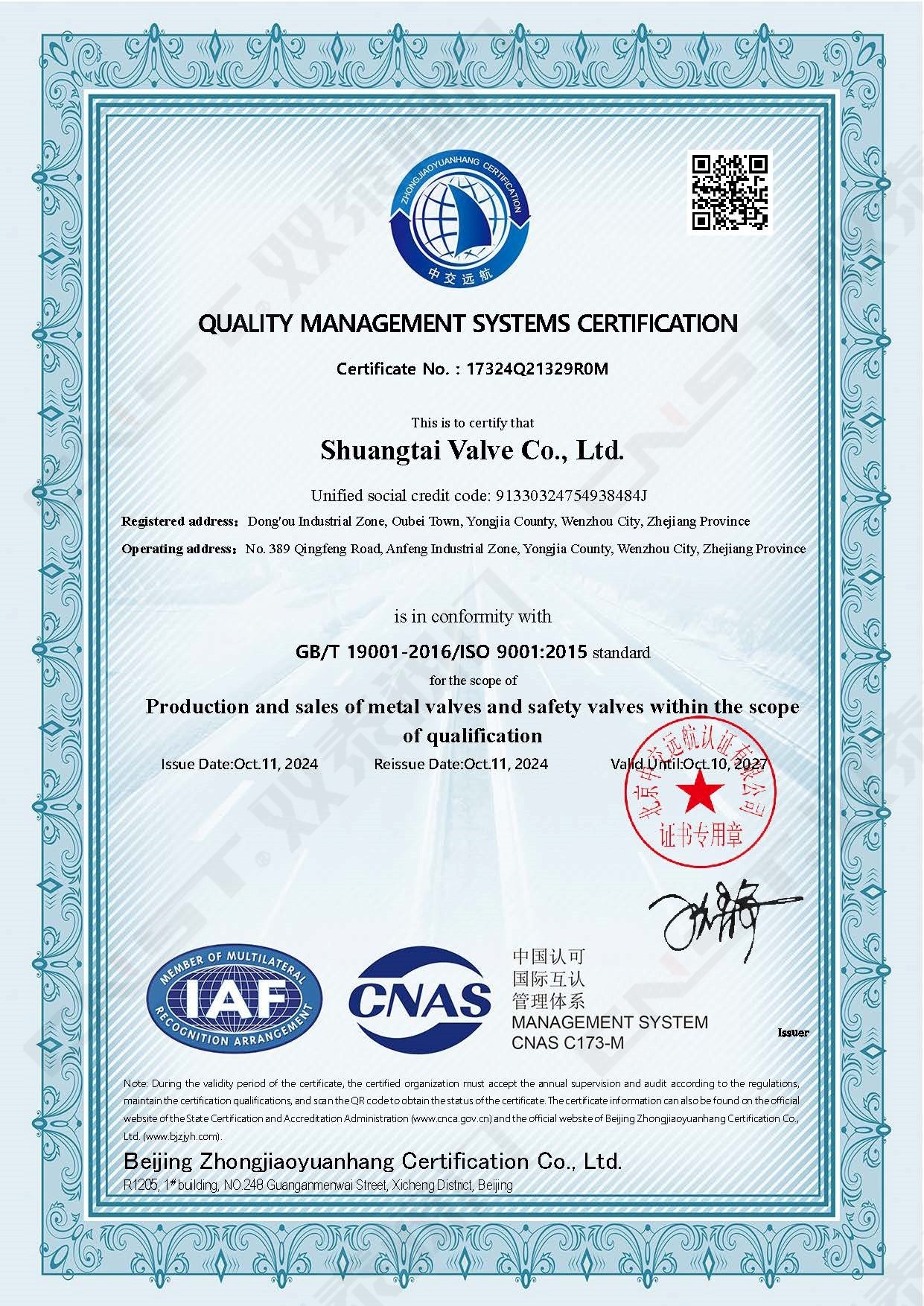 ISO9001質(zhì)量管理體系證書英文版